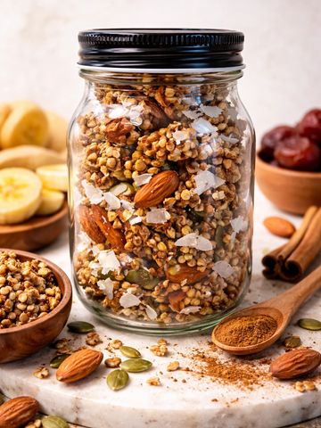 ✔️Sprouted buckwheat granola, almonds, dates, banana.